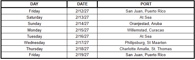 San Juan, Puerto Rico – Sea Day – Oranjestad, Aruba – Willemstad, Curacao – Sea Day – Philipsburg, St Maarten – Charlotte Amalie, St. Thomas – San Juan, Puerto Rico