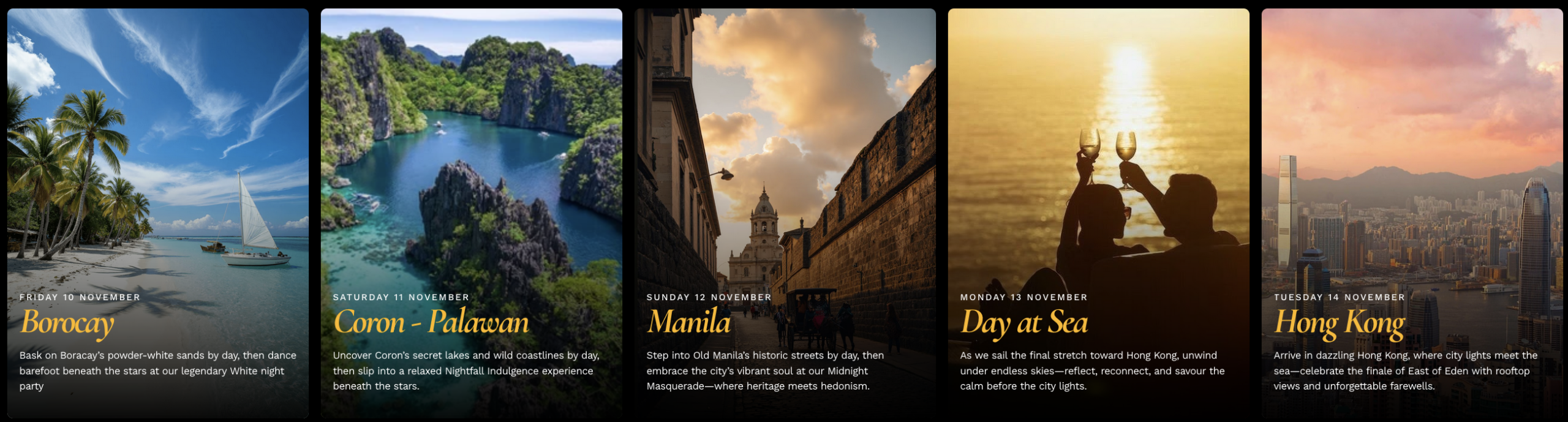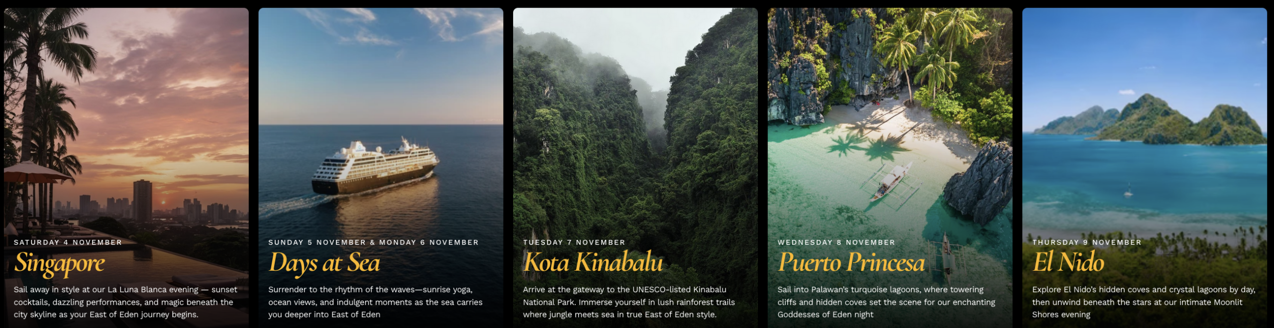 Singapore, Malaysia, Hong Kong and the lush islands of the Philippines: Kota Kinabalu, Puerto Princessa, Le Nido, Coron and Boracay.