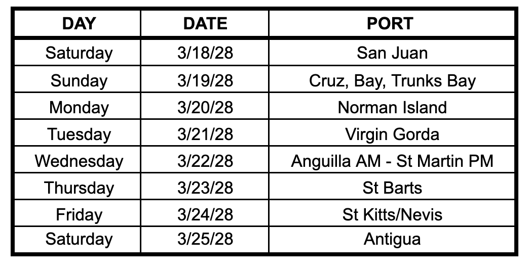 - San Juan, Puerto Rico – St. John – Norman Island – Virgin Gouda – Anguilla & St. Martin – St. Barts – St. Kitts & Nevis – St. John’s, Antigua.