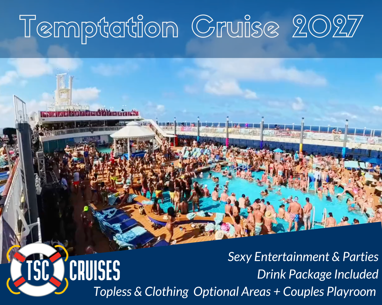 - A Topless-optional and clothing optional Pool Area: The pool deck on our Temptation cruise will be topless-optional for fun in the sun (and no tan lines)!